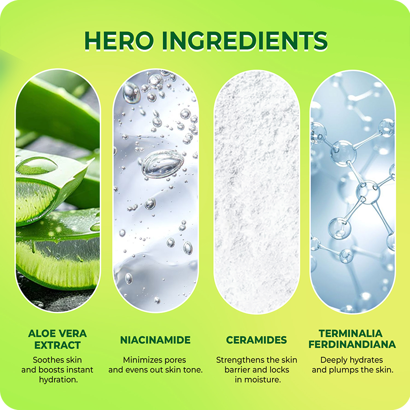 Niacinamide (Vitamin B3), Hyaluronic Acid, Copper Tripeptide-1, Aloe Barbadensis (Aloe Vera) Extract, Glycyrrhiza Glabra (Licorice) Root Extract, Terminalia Ferdinandiana (Kakadu Plum) Fruit Extract, Ceramide NP (and) Caprylic/Capric Glycerides (and) Water, Olive Oil, Capric Caprylic Triglyceride (CCTG), Glycerine, PEG-7 Glyceryl Cocoate, Propanediol, Dm Water, Polyacrylamide (and) C13-14 Isoparaffin (and) Laureth-7, Phenoxyethanol (and) Ethylhexylglycerin, Disodium EDTA, Perfume.