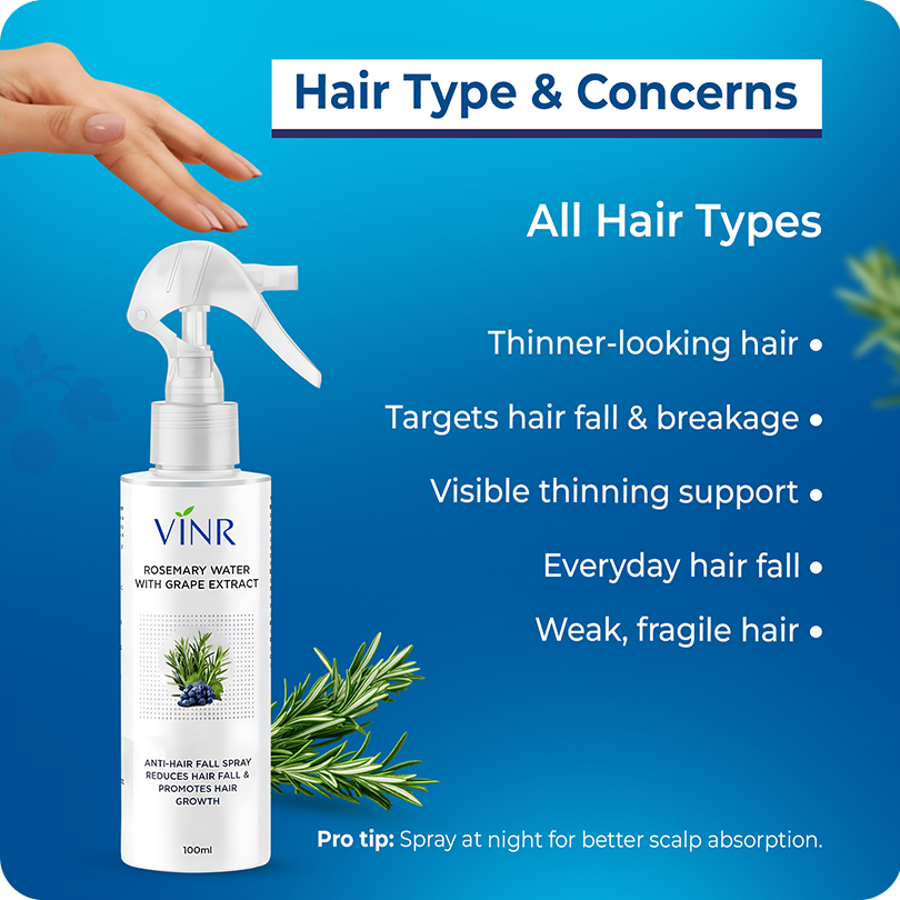 Don’t let hair fall hold you back—try Vinr Rosemary Water Hair Spray with Grape Seed Extract today and enjoy stronger, fuller, and shinier hair. Pair it with the VINR Hair Growth Serum for even better results and take the first step toward revitalizing your hair health now!